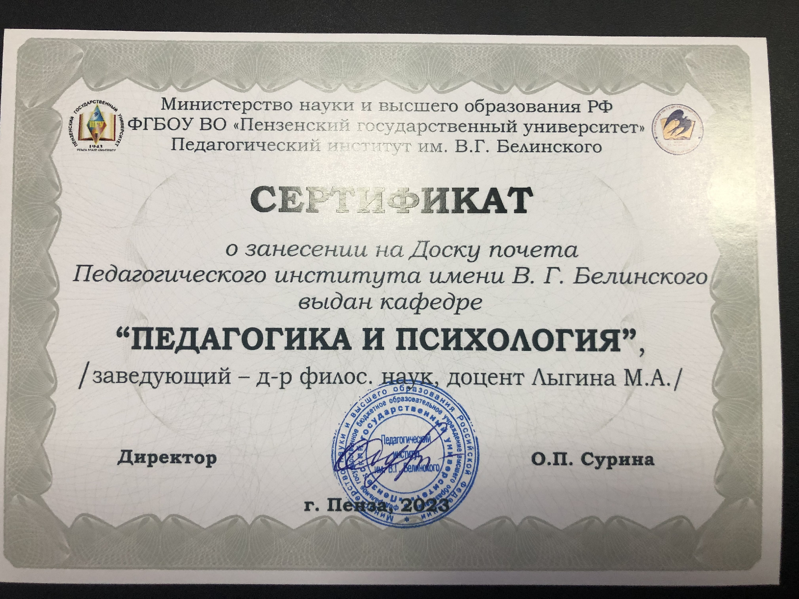 Коллектив кафедры по итогам 2023 года занесен на Доску почета ПИ им. В.Г. Белинского.