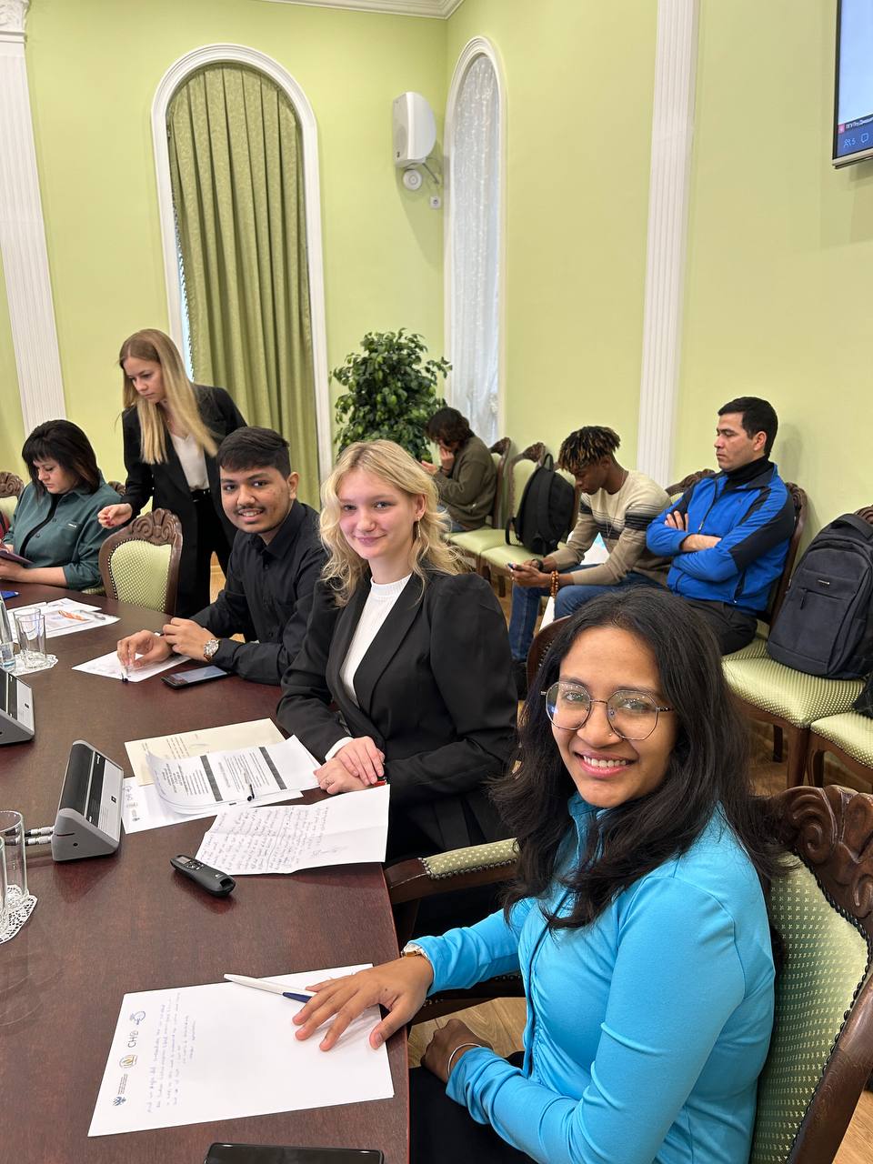 Группа российских и индийских студентов в составе Леоновой Антонины (гр.21НЛ1), Шримали Махи (гр.23ЛЛа4) и Патела Даршила