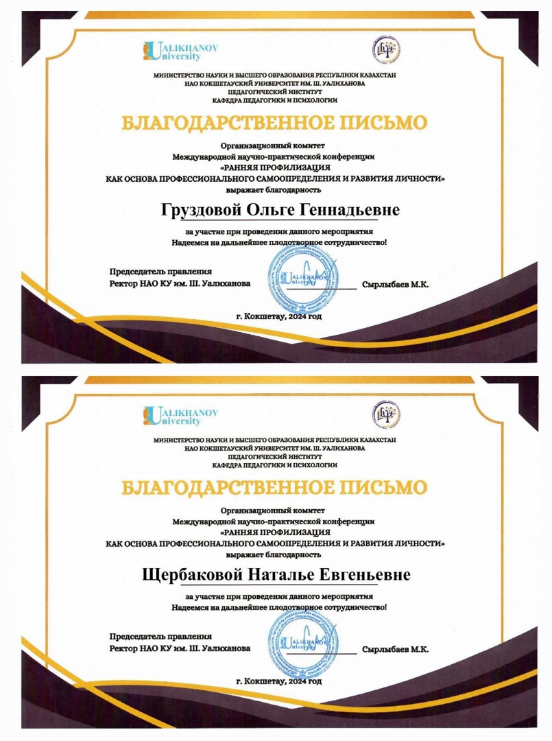 Доценты кафедры «Педагогика и психология» Пензенского государственного университета Груздова О.Г. и Щербакова Н.Е. отмечены благодарственными письмами от имени ректора НАО «Кокшетауский университет имени Ш. Уалиханова» Сырлыбаева Марата Кадирулы за активное участие в проведении Международной научно-практической конференции «Ранняя профилизация как основа профессионального самоопределения и развития личности» (г. Кокшетау, Казахстан).