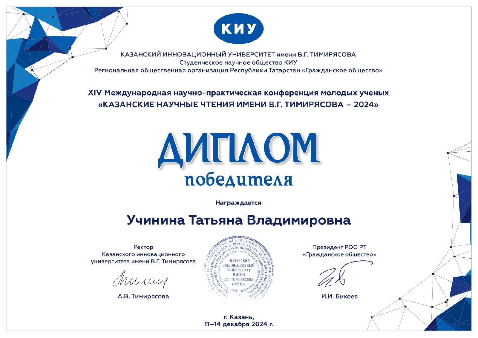 11-14 декабря 2024 г. состоялась XIV Международная научно-практическая конференция молодых ученых «КАЗАНСКИЕ НАУЧНЫЕ ЧТЕНИЯ ИМЕНИ В.Г. ТИМИРЯСОВА – 2024» (г. Казань, КАЗАНСКИЙ ИННОВАЦИОННЫЙ УНИВЕРСИТЕТ ИМЕНИ В.Г. ТИМИРЯСОВА (ИЭУП).