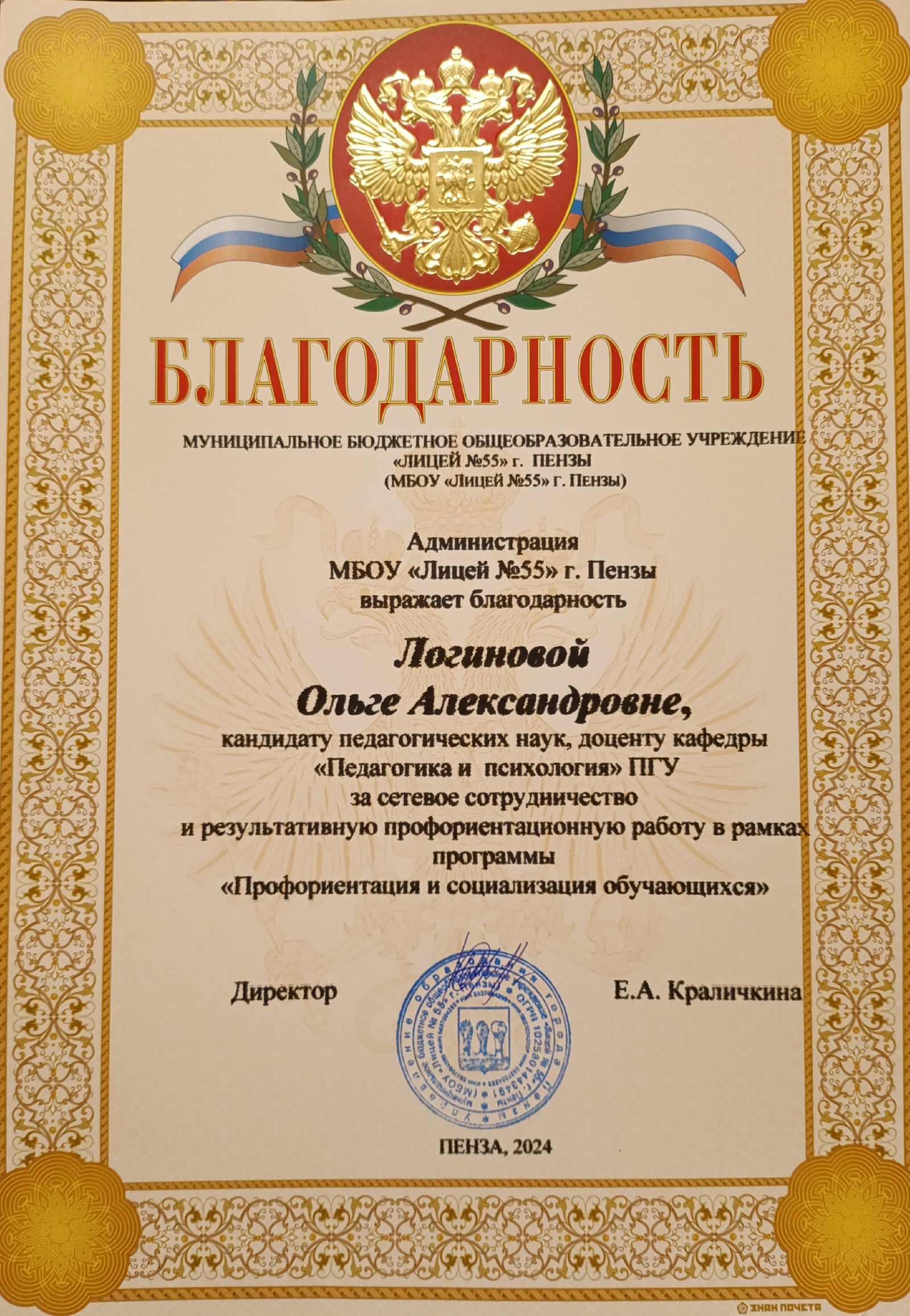 Текст: МБОУ "Лицей N55" г. Пензы 18 декабря 2024 года выразил благодарность к.п.н., доценту кафедры "Педагогика и психология" Логиновой Ольге Александровне за результативную и плодотворную работу в рамках программы "Профориентация и социализация обучающихся".